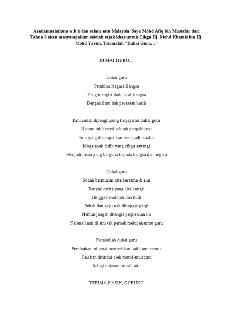 Patik adalah seorang hamba yang mencari-cari haluan diri sebenarPatik adalah putera seorang Melayu yang lahir di Tanah MelayuPatik mengharap kesungguhan patik ini mendapat bantuan sahabat-sahabat dari lapangan yang samabangkitkan Melayu sejati bukanlah sesuatu yang mudah tetapi bukanlah sesuatu yang mustahil. Karangan Sayangi Malaysiaku Sayangi Malaysiaku Dalam meniti arus pemodenan yang bertunjangkan nawaitu materialistik dan individualistik ini semangat cinta akan negara semakin pudar dalam kalangan rakyat. Nukilan Muhammad Fadzli bin KamarudinGuru Besar SK Temong Enggor Perak.