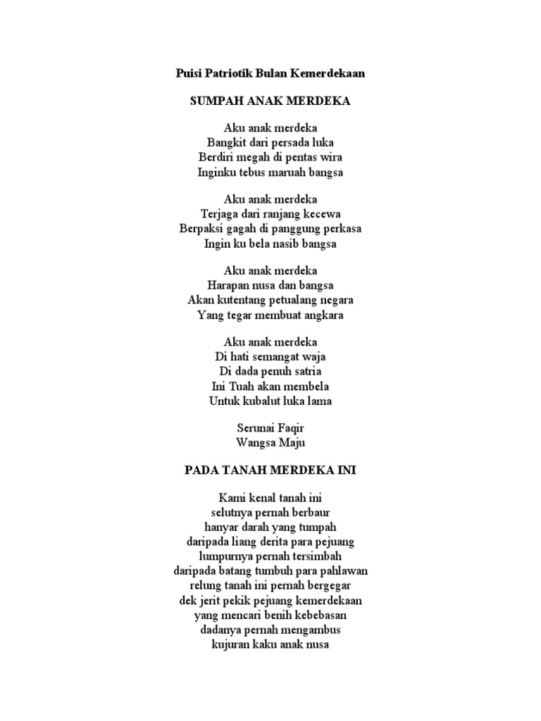 Malaysia kita terkenal di seluruh negara. Contoh sajak merdeka dan 12 koleksi sajak hari kemerdekaansajak sempena hari kemerdekaan malaysia tanggal 31 ogos 1957. Kerana dadah malamku nanah berdarah Dan kerana dia dadah aku jadi padah Dan dia aku ranap parah Semuanya sudah tidak terarah Yang dibawah dipersalah Hilang maruah Cukuplah Aku.